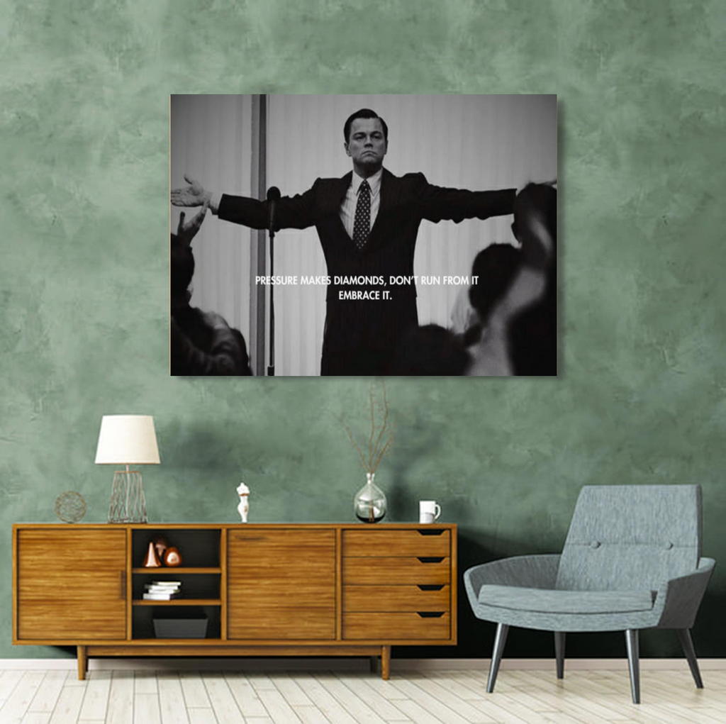 The Wolf of Wall Street Quote Canvas brings the unstoppable confidence of Jordan Belfort into your space. Featuring the iconic quote “Pressure makes diamonds, don’t run from it, embrace it,” this artwork embodies the fearless drive needed to succeed.